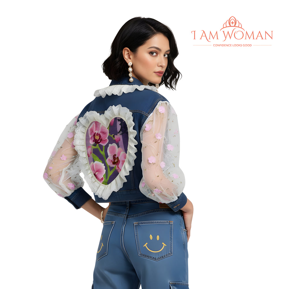 Denim Jacket with Floral SleevesLength: 53 cm Bust: 98 cm Length: 53 cm Bust: 98 cm Length: 53 cm Bust: 98 cm Length: 53 cm Bust: 98 cm Length: 53 cm Bust: 98 cm