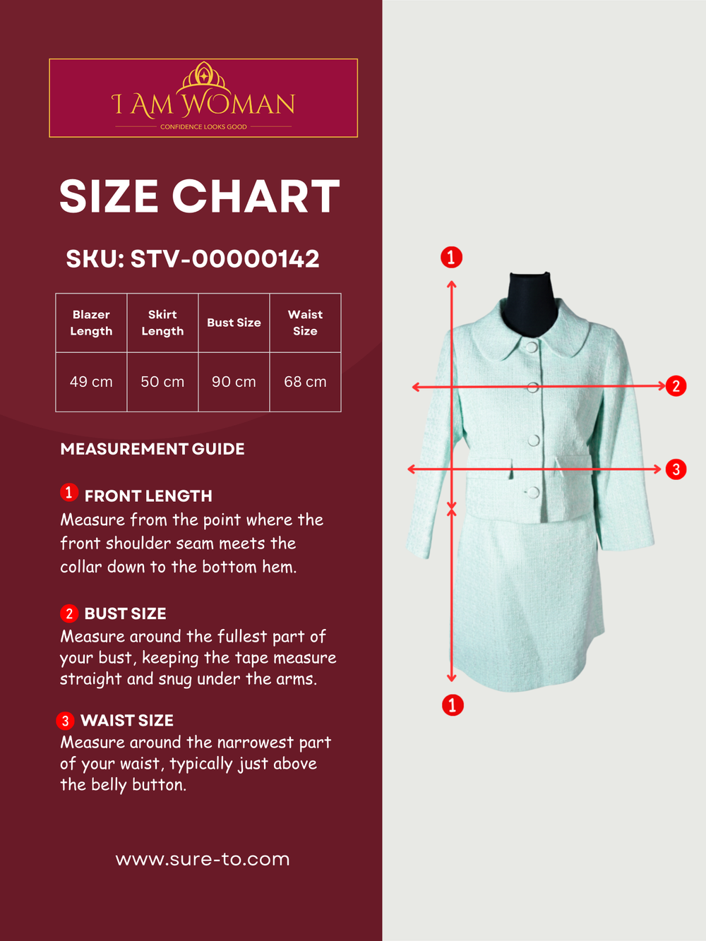 Mint Green Tweed Jacket with Skirt SetBlazer Length: 49 cmBust: 90cm Skirt Length: 50 cmWaist: 68 cm
